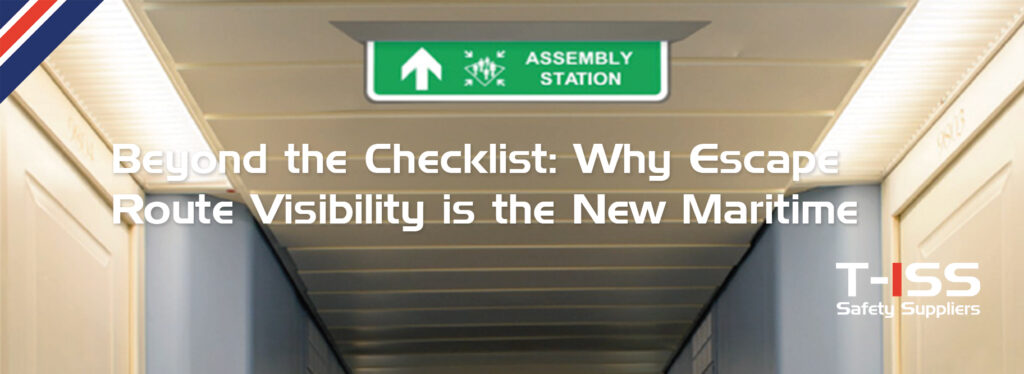 The problem with traditional safety signage is that it often assumes a “best case” emergency. It assumes you have power, or at least enough ambient light to see a wall mounted sign. But in a real world engine room fire or a structural impact, the reality is pitch blackness and thick, disorienting smoke. Research shows that in high stress situations, humans lose their peripheral vision and tend to look down toward the floor. If your primary safety signs are above eye level and unlit, they effectively disappear the moment the smoke hits the ceiling.