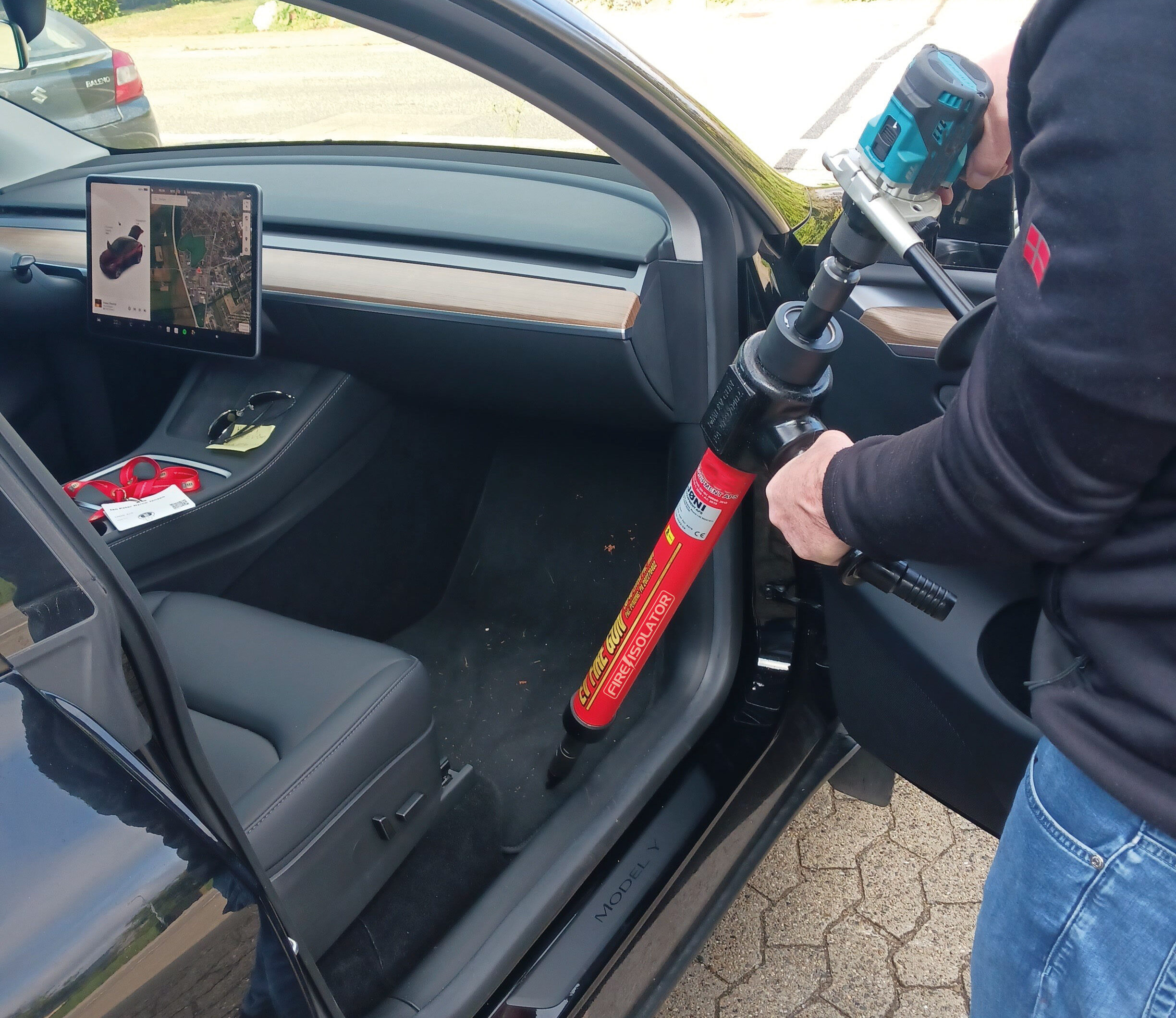 The Fire Isolator EV FireGun is a specialized tool designed to penetrate an EV’s battery housing and flood it with water, cooling the battery from the inside to help stop Thermal Runaway. Unlike traditional methods that require large amounts of water externally, the FireGun delivers 40 liters per minute at two bar directly into the battery pack, offering a more efficient solution.